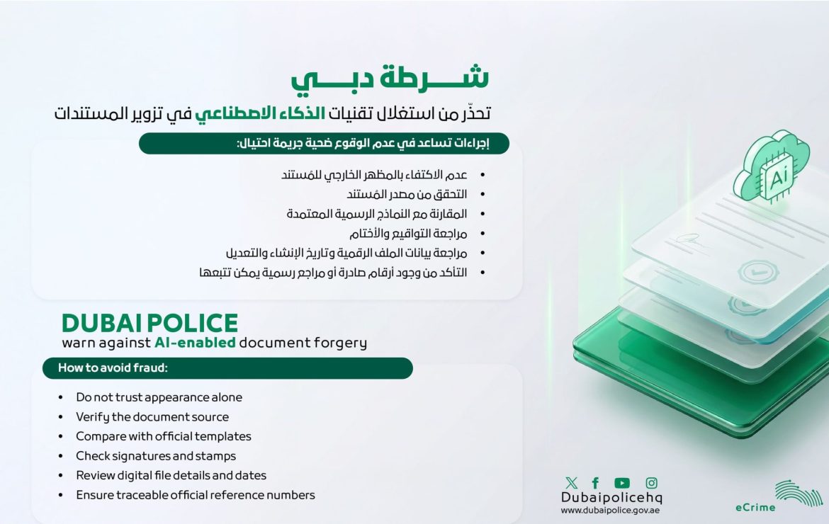 Dubai Police have issued a public warning about the growing misuse of artificial intelligence in forging official and unofficial documents, a tactic increasingly used to commit financial fraud and bypass the law.