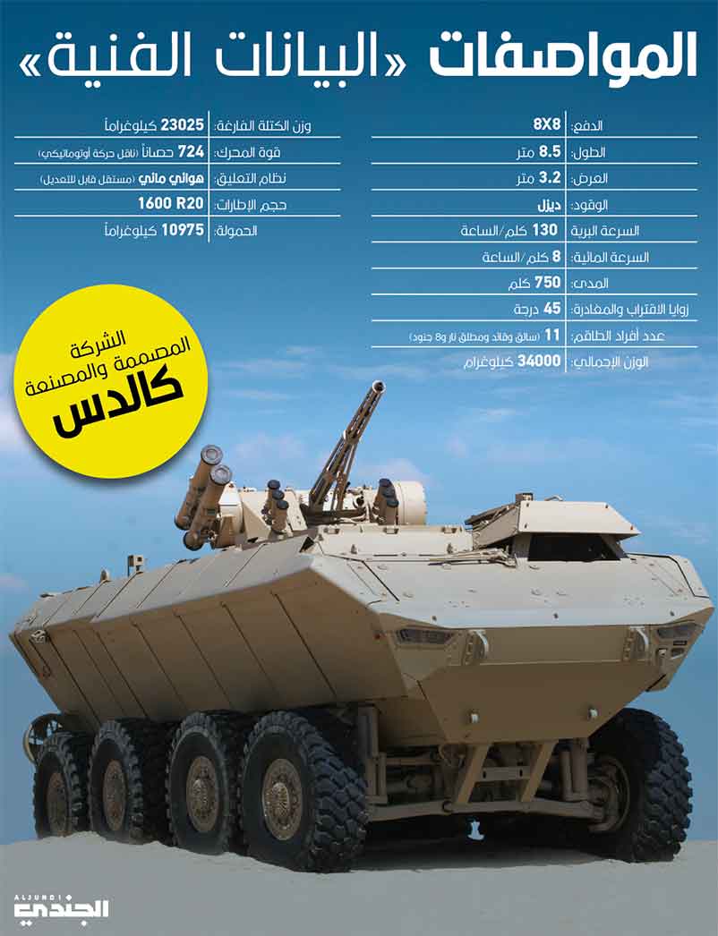 The super armored vehicle, which has a payload of 10,975 kilograms, can accommodate eleven passengers (driver, commander, gunner and 8 soldiers) with comfortable seats provided with shock-absorbing technology, while the total weight of the military vehicle is about 34,000 kilograms, and its empty mass is 23025 kilograms.