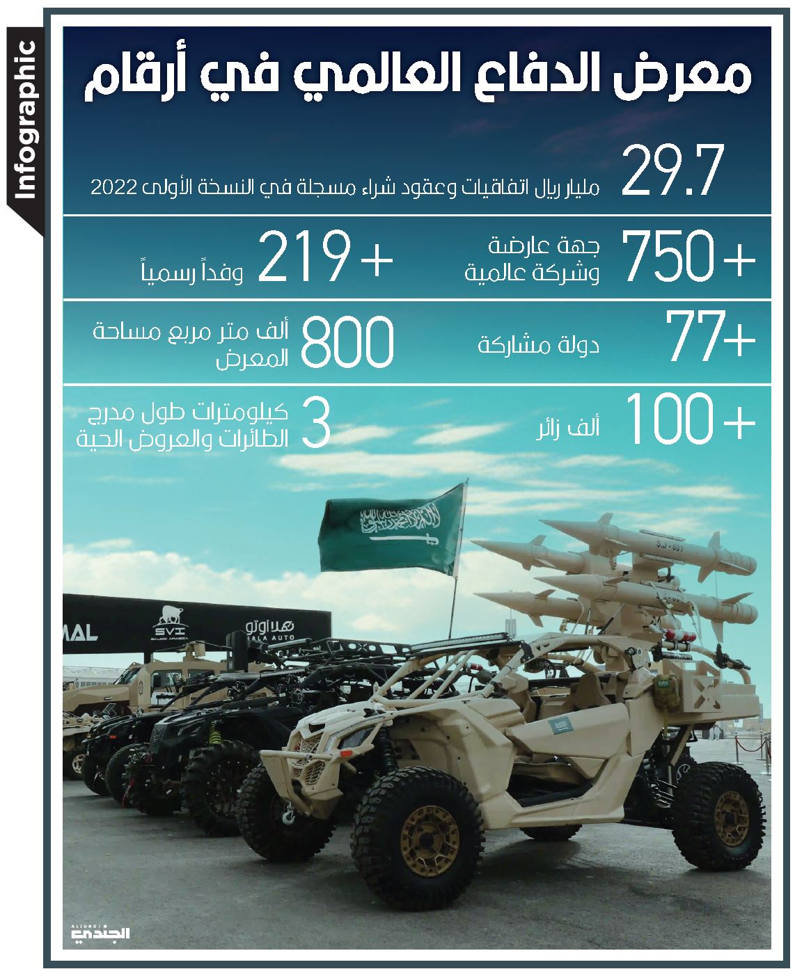 معرض الدفاع العالمي يسهم في تحقيق مستهدفات رؤية المملكة 2030 بشأن تبادل المعرفة وتوطين أكثر من 50% من الإنفاق على المعدات والخدمات العسكرية بحلول 2030. وأضافت أن معرض الدفاع يشكل بيئة جاذبة وحاضنة للمبدعين في مجالات التصنيع العسكري، موضحة أنه يوجد جسر من التواصل بين الموردين والمشترين بهدف إثراء الشراكات الاستراتيجية الدولية فيما يتعلق بالابتكارات العسكرية. ويعد معرض الدفاع العالمي، أحد إنجازات الهيئة العامة للصناعات العسكرية التي تسابق الزمن من أجل الوصول إلى الريادة العالمية في التصنيع العسكري محلياً، حيث تمكنت من الوصول بتوطين التقنيات العسكرية إلى نسبة 12% بنهاية عام 2021، وتواصل السعي الحثيث للوصول نسبة توطين 50% من الإنفاق العسكري بحلول 2030.