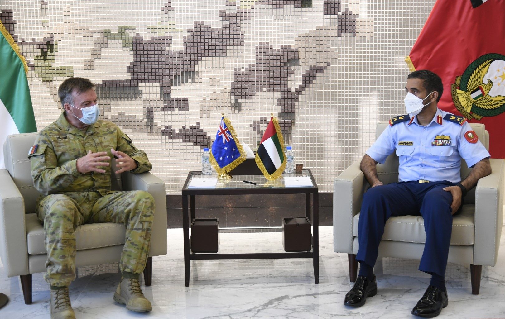 استقبل سعادة اللواء الركن طيار مبارك علي النيادي رئيس الإدراة التنفيذية لسياسات الدفاع و الشؤون الاستراتيجية بوزارة الدفاع بمكتبه الفريق قريق بيلتون رئيس العمليات المشتركة الاسترالية.