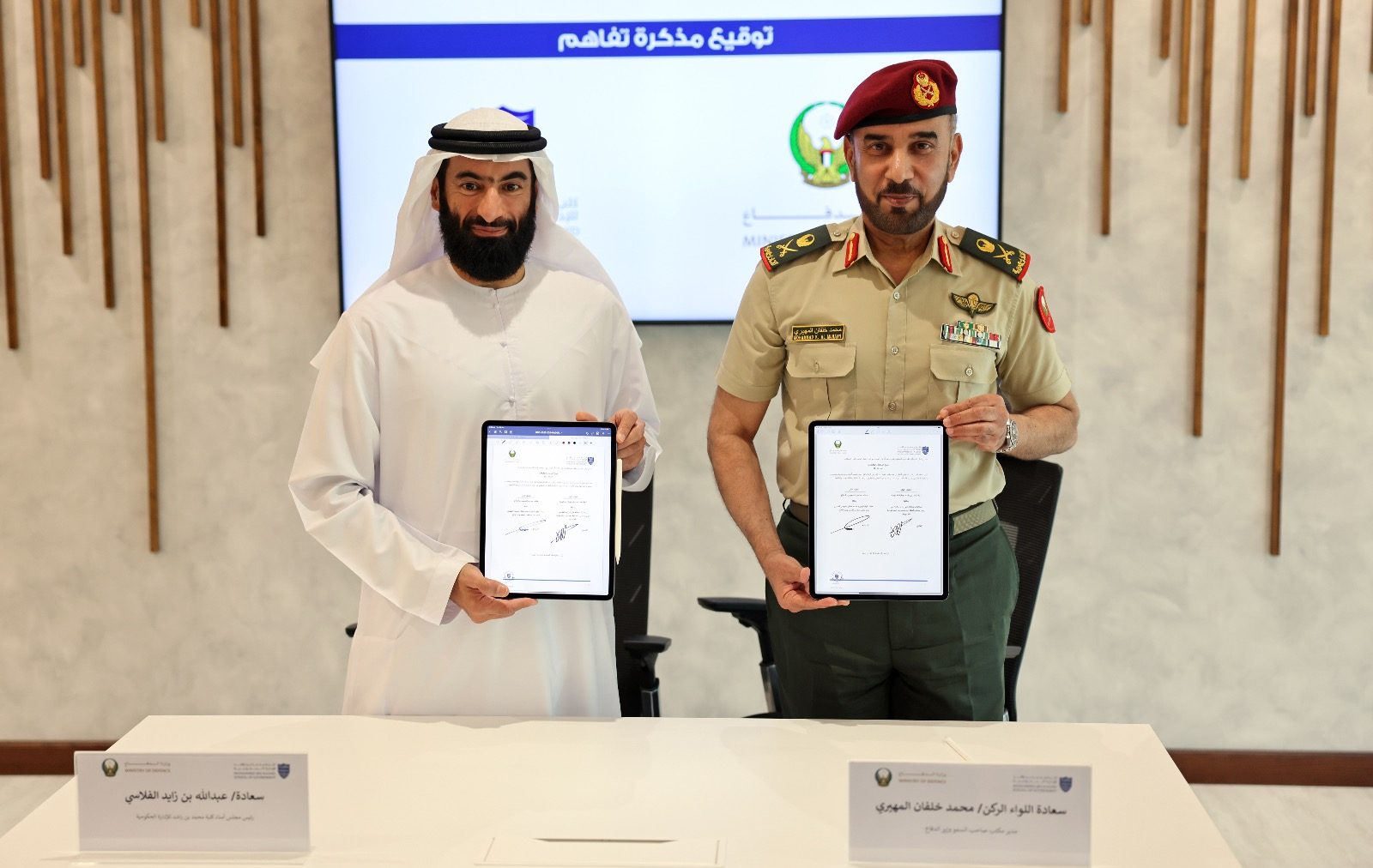 وقع المذكرة عن جانب وزارة الدفاع سعادة اللواء الركن محمد خلفان المهيري، مدير مكتب صاحب السمو الوزير، وعن جانب الكلية سعادة عبدالله علي بن زايد الفلاسي رئيس مجلس أمناء كلية محمد بن راشد للإدارة الحكومية.