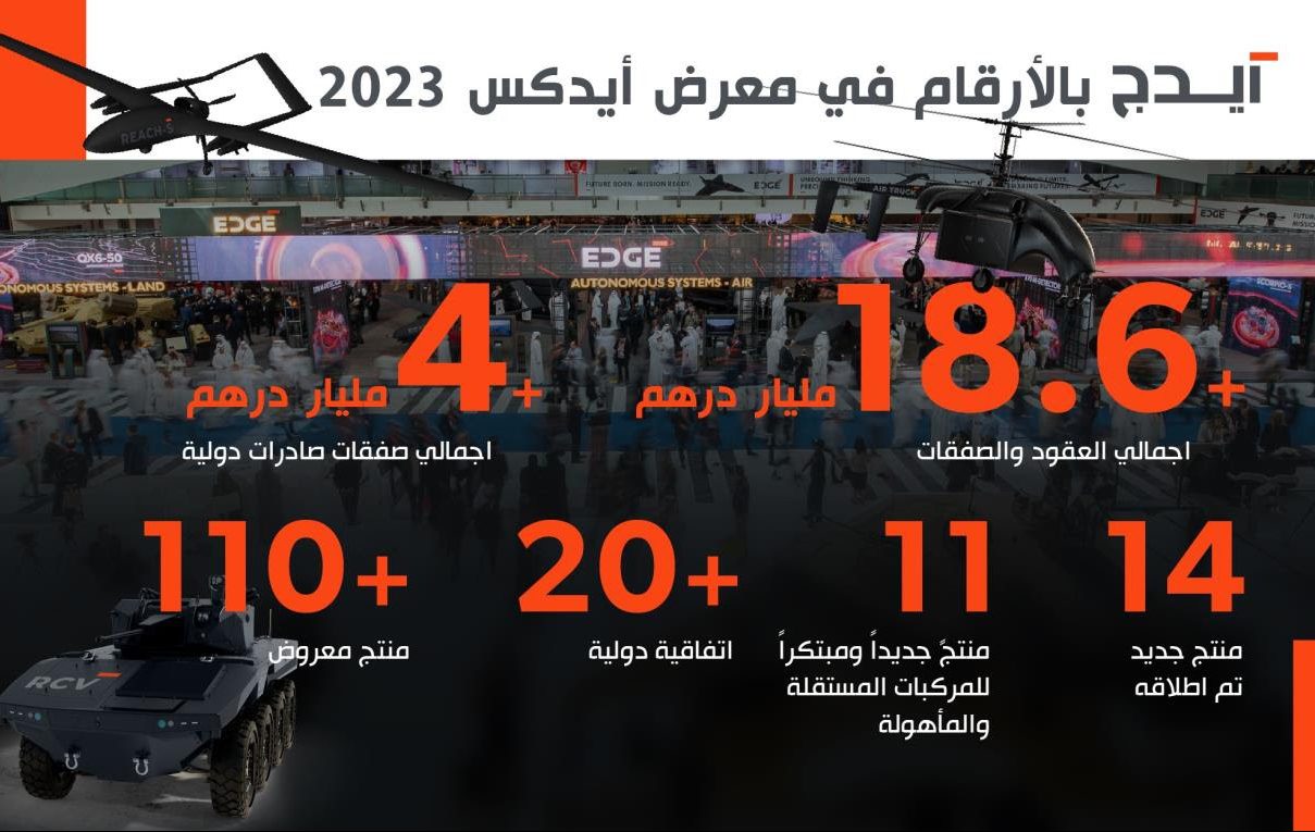 اختتمت «إيدج»، إحدى مجموعات التكنولوجيا والدفاع المتقدمة الرائدة والأسرع نمواً في العالم، مشاركتها الناجحة للغاية في معرض «آيدكس 2023»، حيث أطلقت المجموعة 14 منتجاً جديداً، بما في ذلك 11 من المركبات والحلول المستقلة وغير المأهولة، ووقعت عقوداً وصفقات جديدة بقيمة 18.6 مليار درهم إماراتي، بينها 4 مليارات صفقة تصدير دولية، بجانب العديد من الشراكات والاتفاقيات مع كبار مصنعي المعدات الأصلية وشركات الدفاع والتكنولوجيا والموردين.