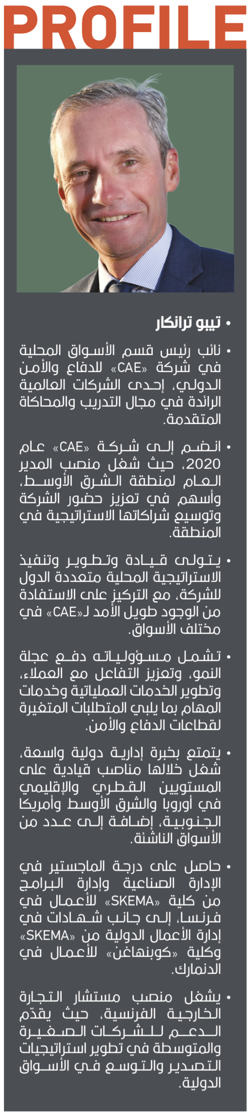 تُعدّ شركة «CAE» العالمية من أبرز الشركات المتخصصة في التدريب والمحاكاة المتقدمة لقطاعات الدفاع والأمن والطيران، ولها حضور متنامٍ في الشرق الأوسط منذ أكثر من عقدين. وفي هذا السياق، التقت مجلة «الجندي» بالسيد تيبو ترانكار، نائب رئيس قسم الأسواق المحلية في شركة «CAE»للدفاع والأمن الدولي، وأجرت معه الحوار التالي: