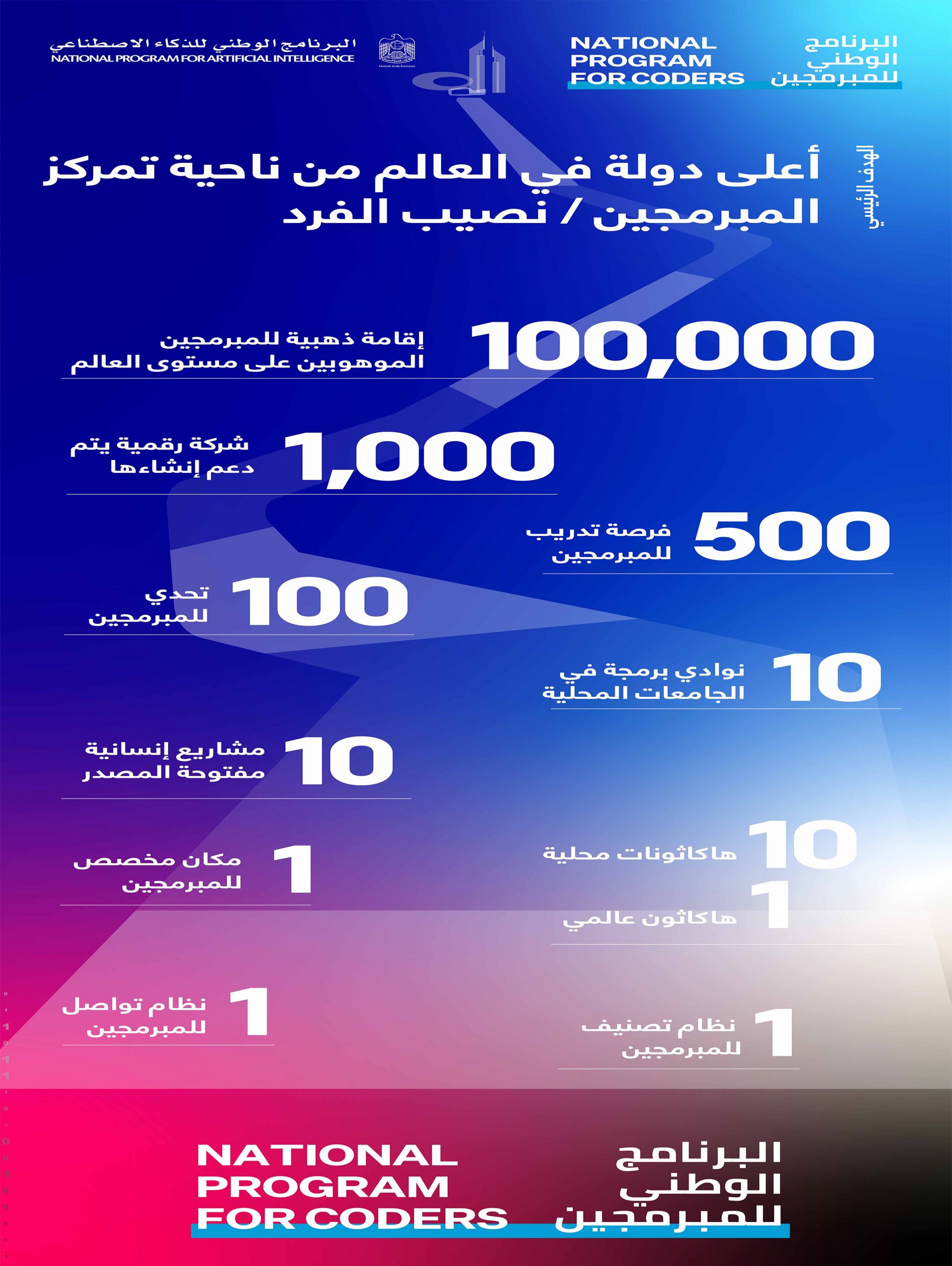 ويهدف “البرنامج الوطني للمبرمجين”، الذي سيشرف عليه مكتب الذكاء الاصطناعي في حكومة دولة الإمارات، إلى دعم المبادرات الوطنية والاستراتيجيات المستقبلية لدولة الإمارات والرامية إلى تنمية قدرات المواهب الوطنية واستقطاب أصحاب المهارات الرقميّة من مختلف أنحاء العالم، وتوفير البنية التحتية اللازمة لإنشاء وتوسيع عدد الشركات المبنية على الابتكار.