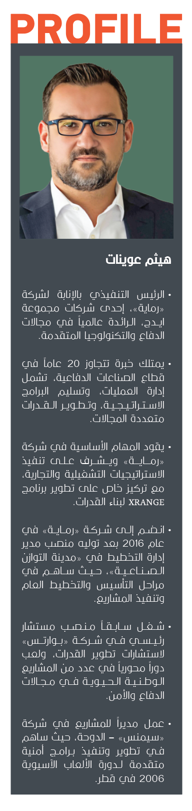 هيثم عوينات الرئيس التنفيذي لشركة «رماية» التابعة لمجموعة «ايدج» للجندي XRANGE تُعزز قدرات الدولة وتُسرّع تطوير وتصدير التكنولوجيا الدفاعية