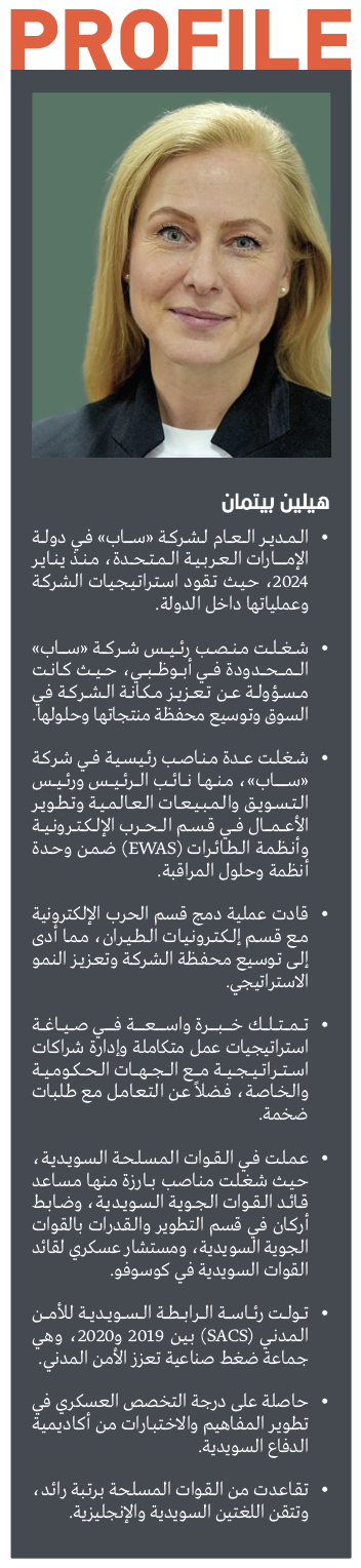 تواصل دولة الإمارات العربية المتحدة تحقيق خطوات نوعية نحو تعزيز مكانتها كواحدة من أبرز الدول الرائدة في مجال التكنولوجيا الدفاعية المتقدمة. وتماشياً مع هذه الرؤية، تعمل شركة «ساب» العالمية على ترسيخ وجودها في الدولة من خلال شراكات استراتيجية مع الحكومة والمؤسسات المحلية، مع التركيز على الابتكار وتعزيز القدرات الدفاعية. وللتعرف أكثر على نهج شركة «ساب» وأولوياتها، التقت مجلة «الجندي» السيدة «هيلين بيتمان»، المدير العام للشركة في دولة الإمارات، وأجرت معها الحوار التالي: