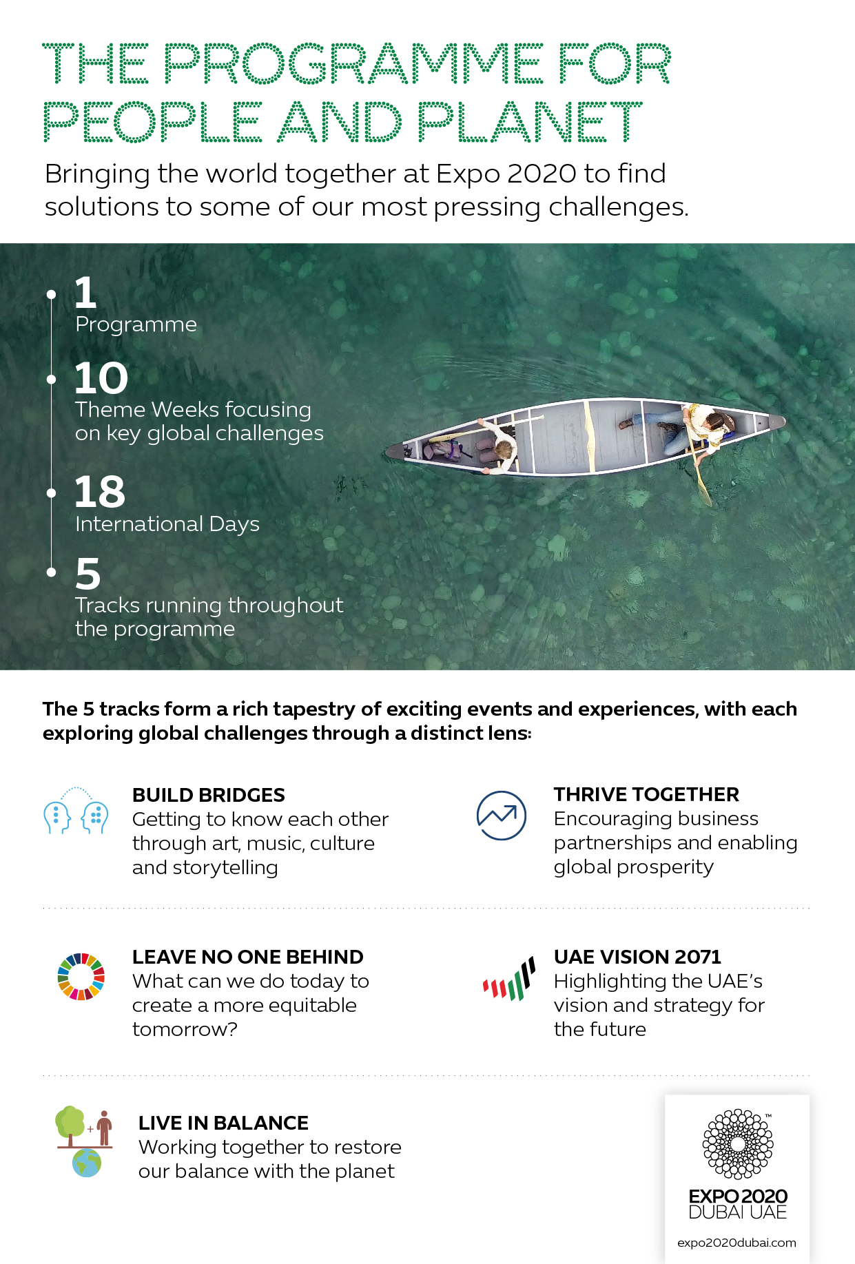 The Programme for People and Planet will run across the entire six months of Expo 2020, anchored by 10 Theme Weeks and 18 International Days, each of which explore key issues of global significance. Through the Theme Weeks, participants will investigate solutions to critical global challenges, ranging from mitigating climate change and biodiversity loss and making human habitats more sustainable, to bridging the digital divide and ensuring equal access to education and healthcare.