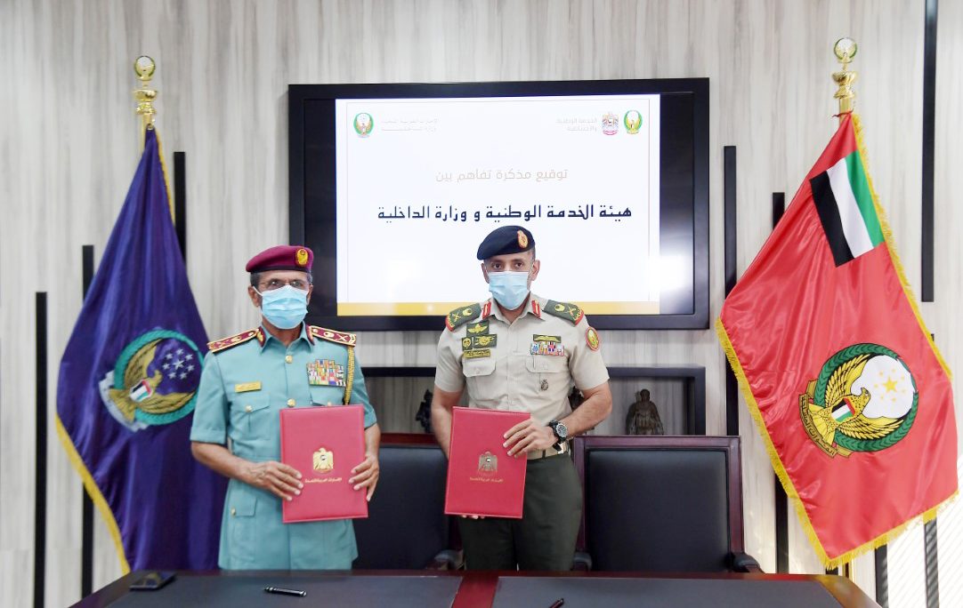 The memorandum of understanding was signed by Major General Pilot Sheikh Ahmed bin Tahnoun bin Mohammed Al Nahyan, Chairman of the National and Reserve Service Authority, and Chairman of the Institutional Development Board in the Ministry of Interior, Major General Khalifa Hareb Al Khaili.