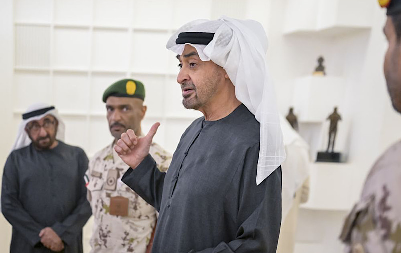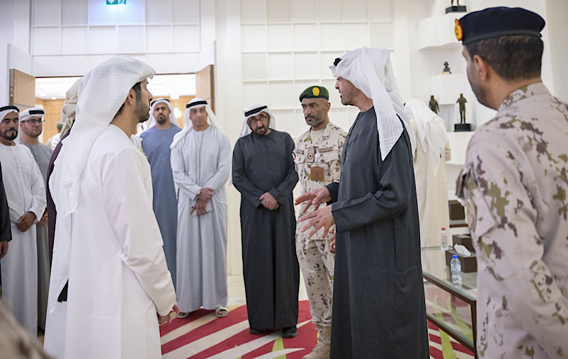 His Highness was accompanied during the visit by H.H. Sheikh Hamdan bin Mohammed bin Rashid Al Maktoum, Crown Prince of Dubai, Deputy Prime Minister, Minister of Defence; H.H. Sheikh Hazza bin Zayed Al Nahyan, Ruler’s Representative in Al Ain Region; H.H. Sheikh Theyab bin Mohamed bin Zayed Al Nahyan, Deputy Chairman of the Presidential Court for Development and Fallen Heroes’ Affairs; Mohamed Mubarak Fadhel Al Mazrouei, Minister of State for Defence Affairs; Lieutenant General Ibrahim Nasser Al Alawi, Under-Secretary of the Ministry of Defence; Hamad Mohammed Thani Al Rumaithi, Military Affairs Adviser to the UAE President; Khaldoon Khalifa Al Mubarak, Chairman of the Executive Affairs Authority; Faisal Abdulaziz Mohammed Al Bannai, Adviser to the UAE President for Strategic Research and Advanced Technology Affairs; and a number of senior officers of the Ministry of Defence..